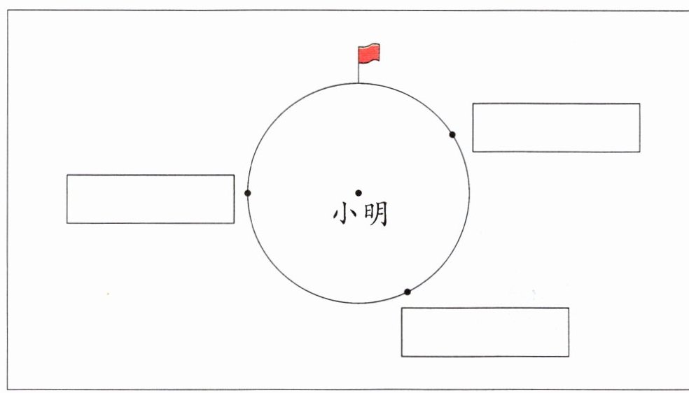 1. 小明面向旗杆站立,此时图书馆在他的2点钟方向,篮球场在他的5点钟方向,食堂在他的9点钟方向。请在框中写出三个地点的名称。