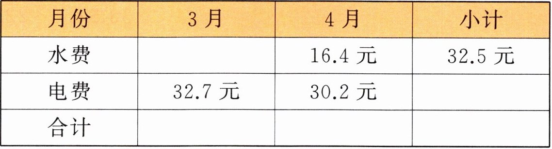三、下表是小书记录爷爷家里这两个月的水电费支出情况,把表格填写完整。