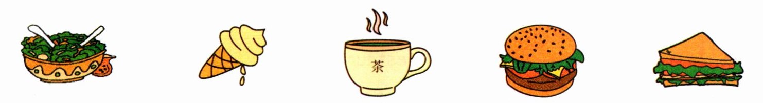解析 听录音前,快速浏览图片,了解图片内容,听时注意抓住关键词。根据听力材料,依次听到的关键词为 sandwich, salad, hamburger, tea, ice cream。故答案为2,5,4,3,1。