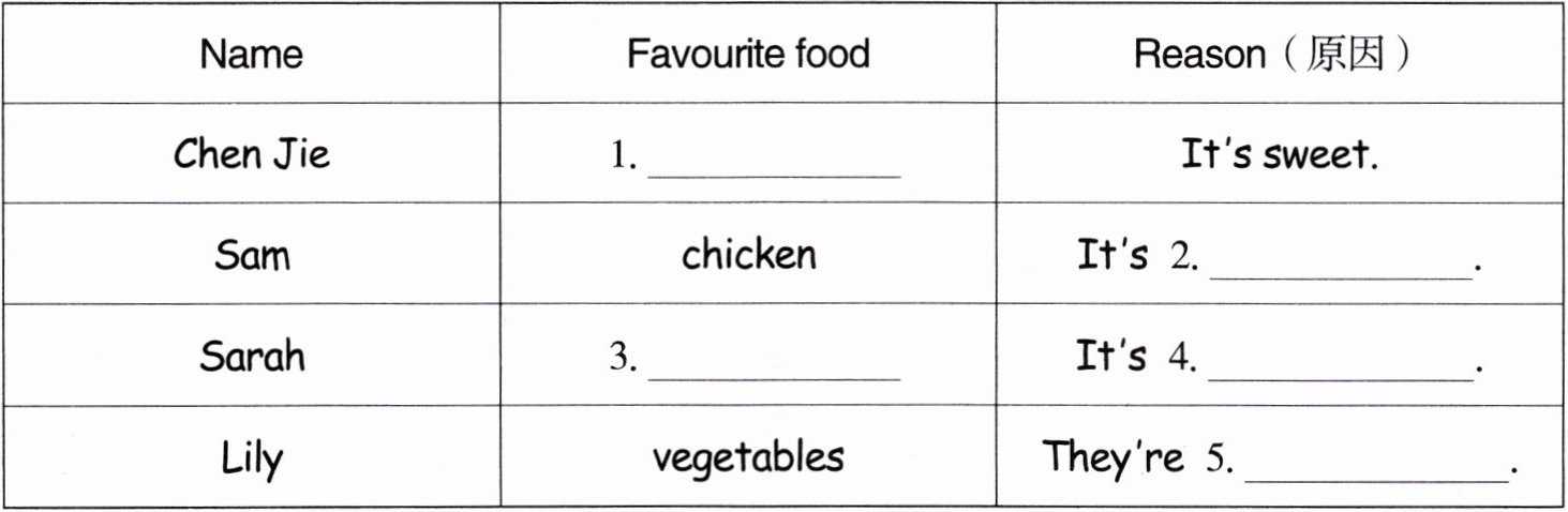 根据听力材料Sarah和Chen Jie的话“My favourite food is ice cream. It's sweet. My favourite food is salad. It's healthy.”和Lily和Sam的话“My favourite food is chicken. It's delicious. My favourite food is vegetables. They're fresh.”可知答案依次为ice cream, delicious, salad, healthy, fresh.