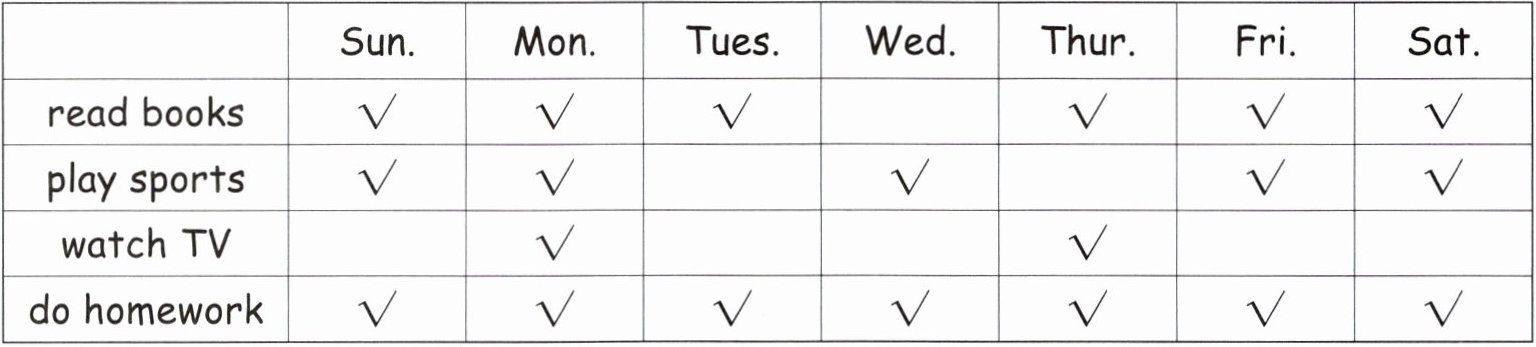 | do homework | √ | √ | √ | √ | √ | √ | √ |
