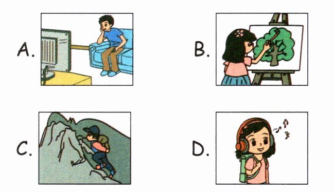 1.C 2.D 3.A 4.B 解析 1. 句子句意:他的爱好是爬山。对照图片可知答案为 C。 2. 句子句意:Lily 喜欢听音乐。对照图片可知答案为 D。 3. 句子句意:我的弟弟喜欢看电视。对照图片可知答案为 A。 4. 句子句意:我的爱好是画漫画。对照图片可知答案为 B。