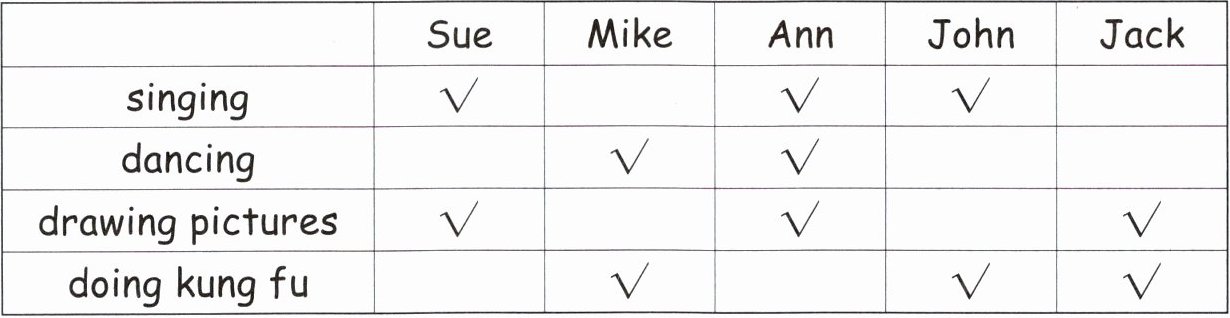 1. T 2. T 3. T 4. F 解析 1. 根据表格可知,喜欢练功夫的是 Mike、John 和 Jack 三个人,故答案为 T。 2. 根据表格可知,Jack 喜欢画画和练功夫,故答案为 T。 3. 根据表格可知,Sue 和 Ann 都喜欢唱歌,故答案为 T。 4. 根据表格可知,Mike 喜欢跳舞和练功夫,没有唱歌,故答案为 F。