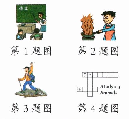 1.studies 2.cooks 3.goes hiking 4.puzzles 解析 1.根据图片和首字母提示,可知是study Chinese(学汉语)。句子主语he为第三人称单数形式,谓语动词要用单三式,故填studies。 2.根据图片和首字母提示,可知是cook Chinese food(做中国菜)。句子主语Mr Jones为第三人称单数形式,谓语动词要用单三式,故填cooks。 3.根据图片和首字母提示,可知是go hiking(去远足),句子主语Jack为第三人称单数形式,谓语动词要用单三式,故填goes hiking。 4.根据图片和首字母提示,可知是do word puzzles(猜字谜),故填puzzles。