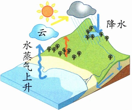 雨是从云中降落的水滴。如图所示,在太阳的照射下,陆地和海洋表面的水蒸发变成水蒸气,水蒸气上升到一定高度后遇冷变成小水滴或小冰晶。这些小水滴或小冰晶又小又轻,被空气中的上升气流托在空中汇聚成了云。这些云滴要变成雨滴落到地面,大约要增大100多万倍。当云滴越长越大,最后大到空气再也托不住时,便从云中落到地面,成为我们常见的雨水。雨水是人类生活中重要的淡水资源,植物也要靠雨露的滋润才能茁壮成长,但暴雨造成的洪水也会给人类带来巨大的灾难。