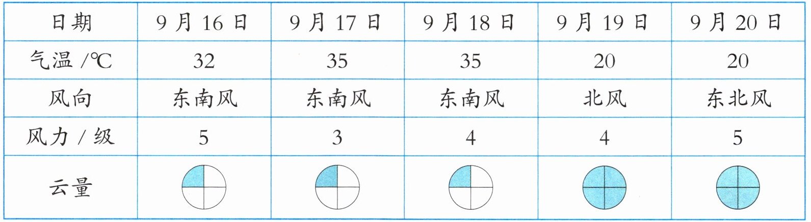 1. 小秋已经观测了一段时间的天气了,并做了下表所示的记录。
