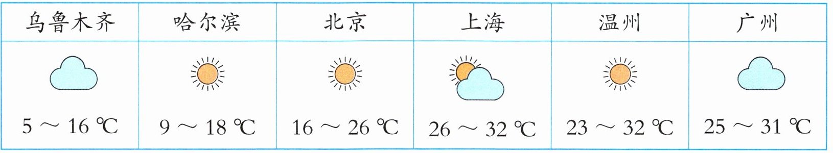 在查看天气预报时,小秋顺便查看了一些其他城市的天气预报,了解其他城市的天气情况,如下表所示。
