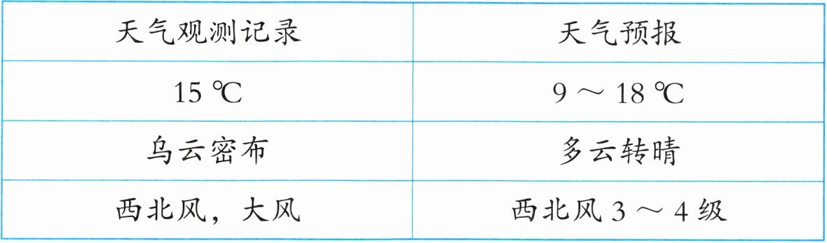 4. 对比下表中的天气观测记录和天气预报,下列说法错误的是( )。