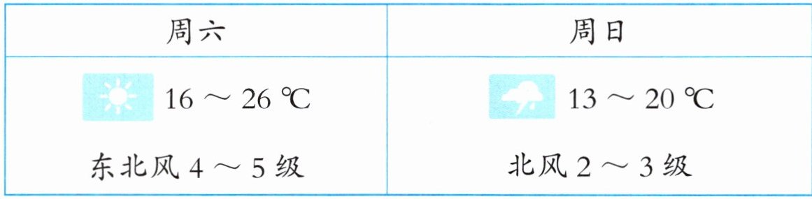 一、下表所示是小秋记录的周末的天气预报。