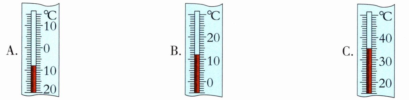 2. 当环境温度低于0℃,水的温度下降到0℃时,水开始结冰。A图中温度计的示数是 - 8℃,这个温度说明试管里的水已经结冰了;B图中温度计的示数是12℃,C图中温度计的示数是35℃,这两个温度均在0℃以上,试管中的水不会结冰。