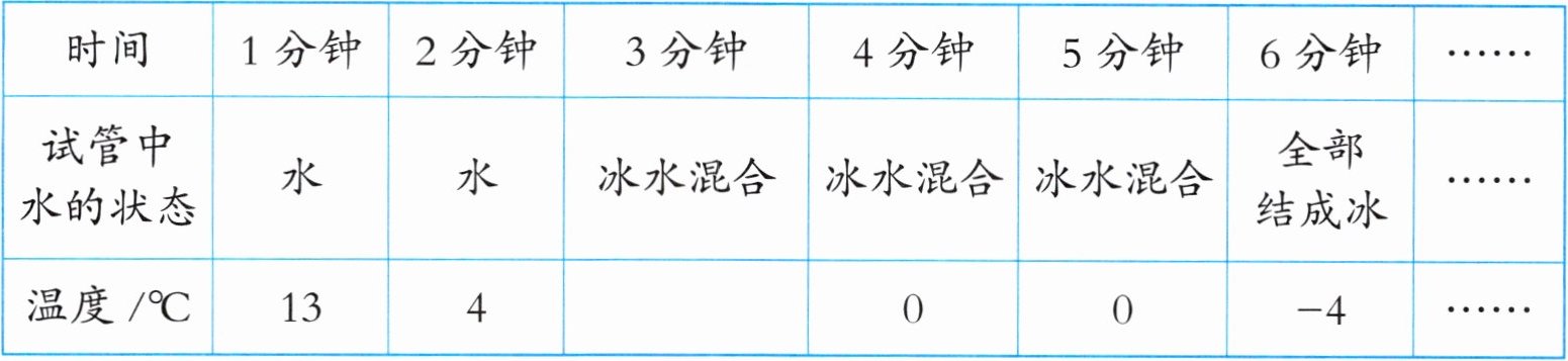 |试管中水的状态|水|水|冰水混合|冰水混合|冰水混合|全部结成冰|……|