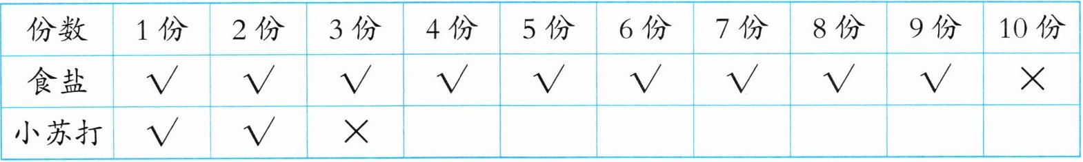 (1)根据表格数据可知:在常温下,50毫升水大约能溶解_____份食盐,大约能溶解_____份小苏打。