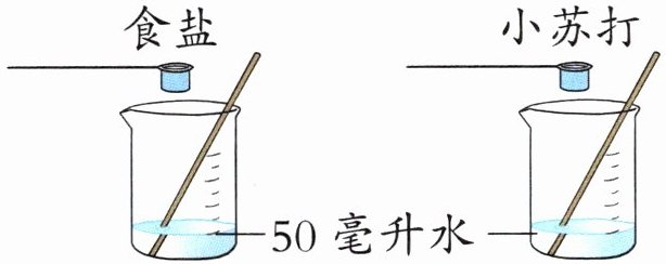 一、如下图所示,为了比较食盐和小苏打在水中的溶解能力,小秋准备通过实验探究“在50毫升水中食盐和小苏打的最多溶解量”。