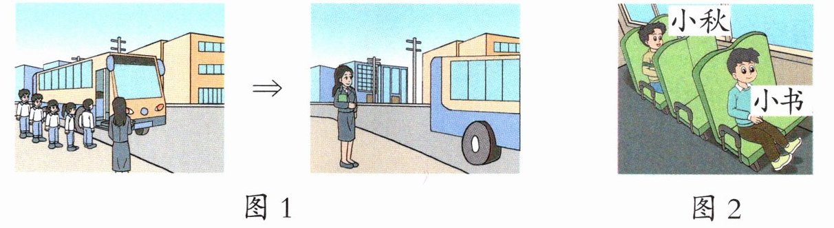 2.放学了,老师将同学们带到上车点,校车来了,小秋和同学们上车了,老师在上车点目送同学们上车回家(如下图)。