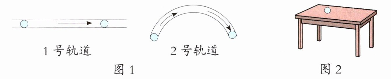 2. 如图2,小秋用手将小球沿桌面推出,请在图2中分别画出小球在桌面上的运动路线和小球冲出桌面后的运动路线。