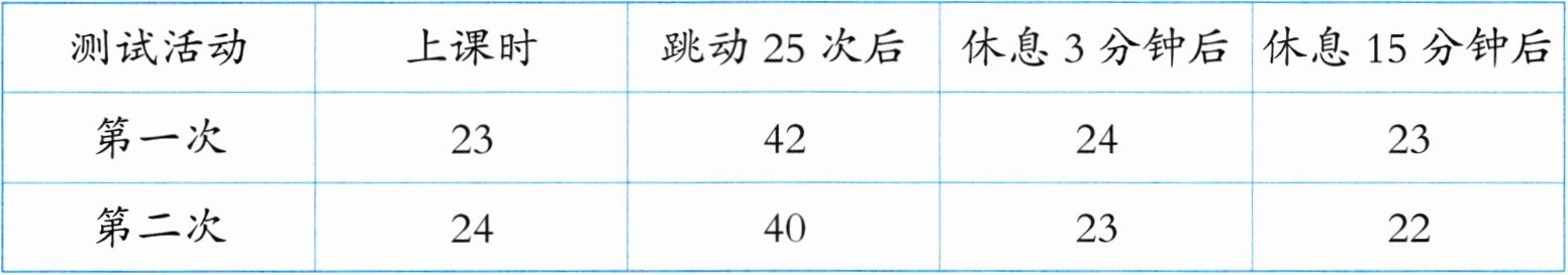 |测试活动|上课时|跳动25次后|休息3分钟后|休息15分钟后|