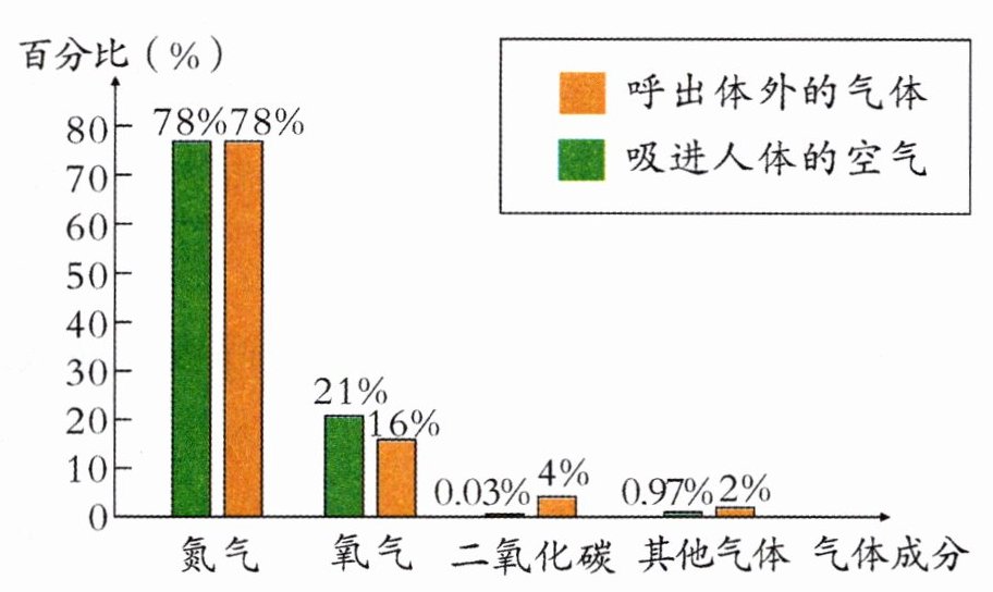 (4)本题考查了呼吸时空气成分的变化。由图可知,呼出的气体与吸入的气体相比,氧气的含量减少,氮气的含量不变,二氧化碳和其他气体的含量增加。