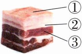 2. 小秋观察一块猪肉(如右图),发现它分为较硬的猪皮、白色的肉、红色的肉这几部分。其中脂肪含量最丰富的是( )。