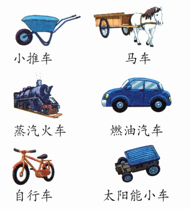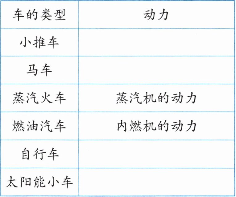 下图所示是不同类型的车,它们使用了不同的动力。请观察图片,并将下面的表格填写完整。