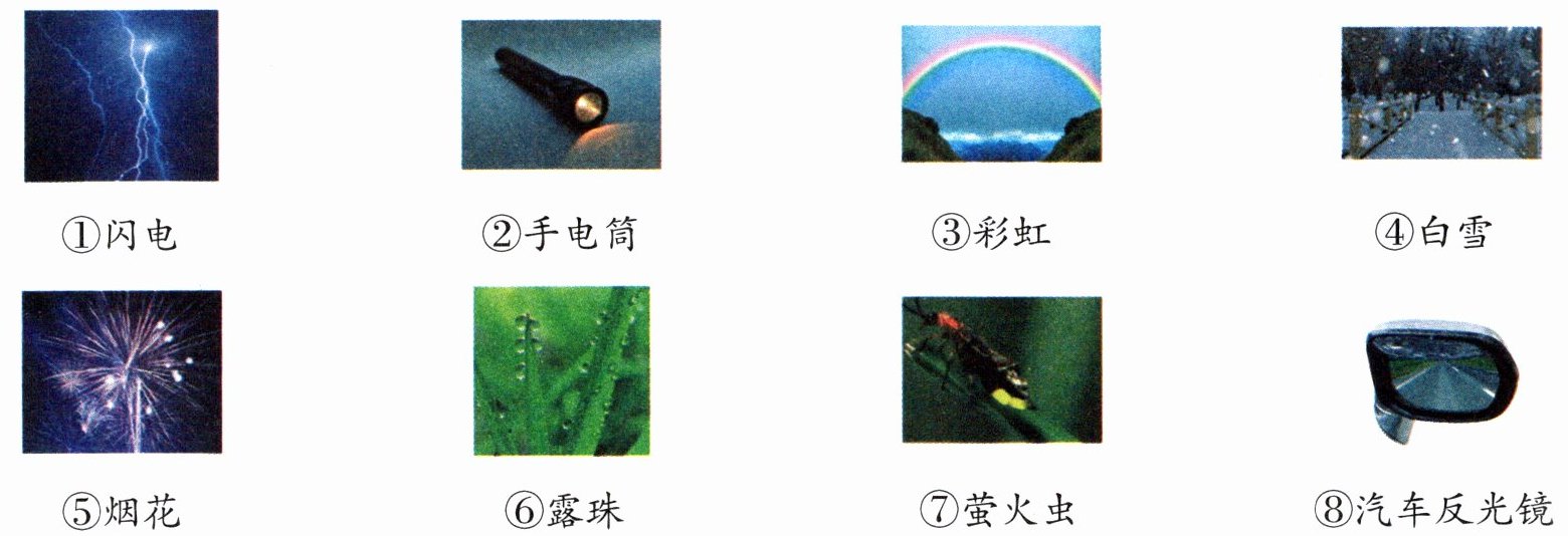 2. 光源可以分为自然光源和人造光源两类。上图所示的物体中,属于自然光源的有______,属于人造光源的有______。(均填序号)