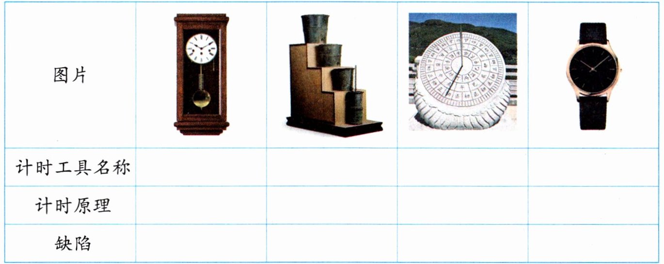 缺陷:I.必须依赖日照,阴天和黑夜不能计时 J.水会结冰,不适合在寒冷的环境中使用 K.电子表需要及时更换电池,机械表需要按时上发条 L.需要经常上发条提供动力