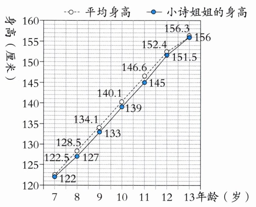 1. 小诗的姐姐每年生日都测量身高,右图是她7~13岁的身高与全国同龄女生的平均身高的对比统计图。