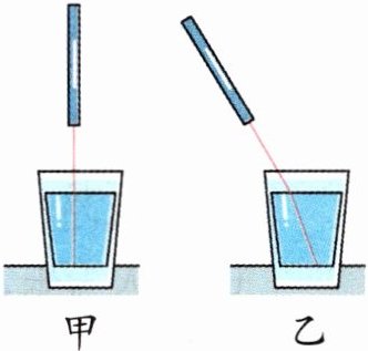 如右图所示,小秋利用一支激光笔、水和一个透明玻璃杯进行实验,分别将激光笔射出的光垂直和倾斜射入盛有水的玻璃杯中,观察光的传播方向是否发生改变。