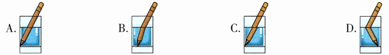 1. 小秋把铅笔倾斜放入盛有水的玻璃杯中,观察到的现象是( )。