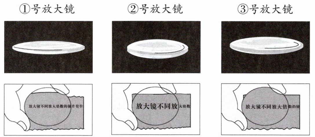 观察现象:上面3个放大镜,凸度最大的是______号,放大倍数最大的是______号,视野最大的是______号。(填序号)