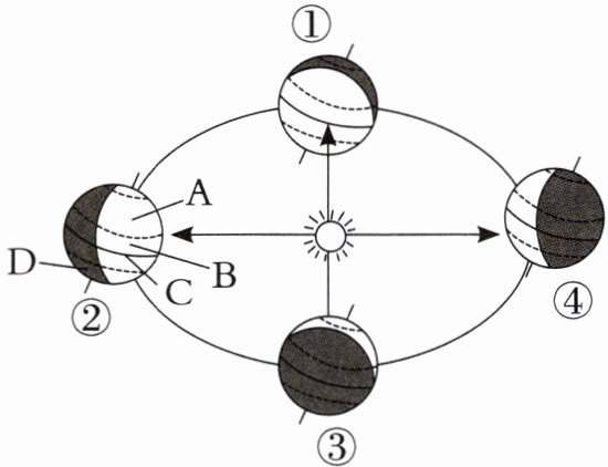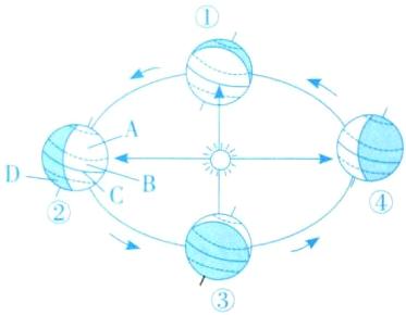 4.当地球绕太阳转动到②处时,A点处于______季,D点处于______季。