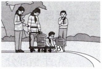 如右图,分别用平板和手推车运送物品。先将两个箱子沿直线从A点运输到B点,然后用平板和手推车将两桶水沿曲线从B点运输到C点,用秒表计时并做比较。