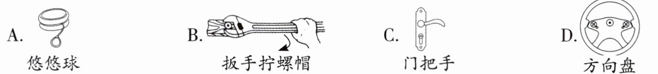 解析:3. 悠悠球是在轴上用力带动轮运动,是费力轮轴;其他三个是在轮上用力带动轴运动,是省力轮轴。