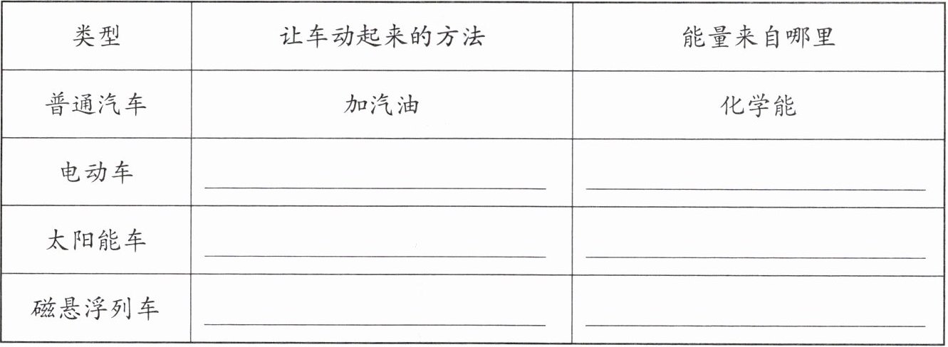 1.车的行驶需要能量,汽油为多数汽车提供了能量。有哪些方法可以让车动起来?车运动的能量来自哪里?请完成下列表格。