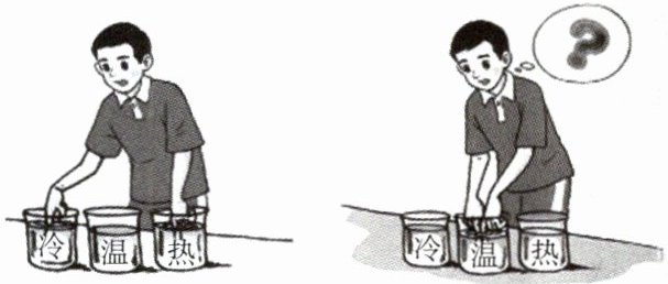 例1 如图所示,小安先把两只手指分别放入热水和冷水中,会感觉到热水较热,则热水的温度