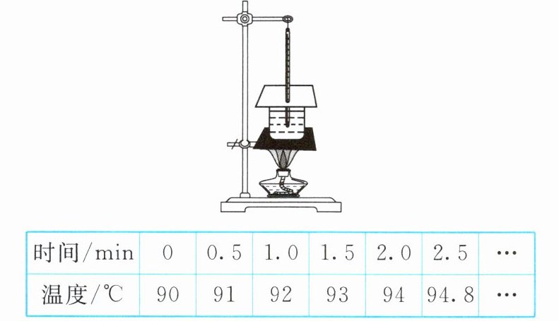 |实验过程|组装实验器材如图所示,将温度计的玻璃泡全部浸入水中。不要碰到烧杯壁或烧杯底,仔细观察,在水温接近90℃时开始计时,每隔0.5min记录一次数据,直到水沸腾4~5min后为止。|