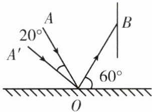 2. 如图所示,入射光线AO经水平放置的平面镜反射后,射到竖直墙壁上的B点,OB与镜面的夹角为60°。当AO绕入射点O逆时针旋转20°,转动到A′O的位置时,可以将平面镜绕O点