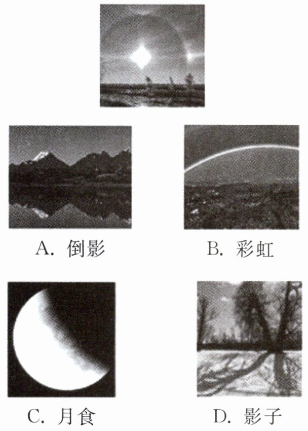 2. “幻日”是一种大气光学现象,在天空中的薄云里面分布着大量微小的六角冰晶,有时它们会整齐地排列在空中,当太阳光射入六角冰晶后,便会在空中出现太阳的像,从而呈现出多个太阳,如图所示。幻日的形成与下列选项中的现象成因相同的是(