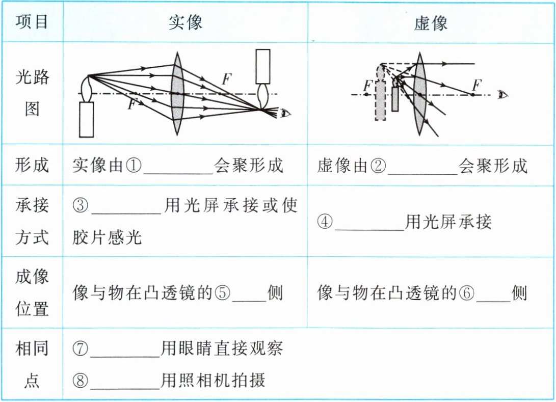①实际光线;②光线的反向延长线;③能;④不能;⑤异;⑥同;⑦能;⑧能