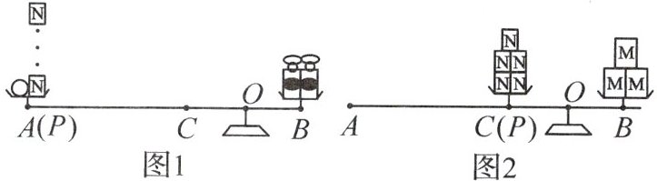 (3)测量小球的质量:如图1,右侧托盘放置2个$100\ g$砝码,左侧托盘放入一个小球和若干个$N$物体,滑动点$P至点A$处,天平恰好平衡,若再次向左侧托盘中加入相同数量的$N$物体,发现点$P移动到PC = OC$时,天平平衡,求这个小球的质量.