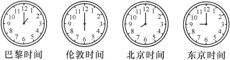 解:各城市相应钟表上时针与分针所成的角分别为$30^{\circ}$,$180^{\circ}$,$120^{\circ}$,$90^{\circ}$.
