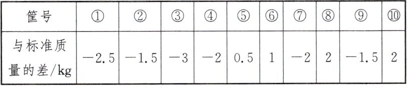 (1)根据题意可知,(-2.5)+(-1.5)+(-3)+(-2)+0.5+1+(-2)+2+(-1.5)+2=-7(kg),15×10+(-7)=143(kg). 答:这10筐红薯叶的总质量为143 kg.