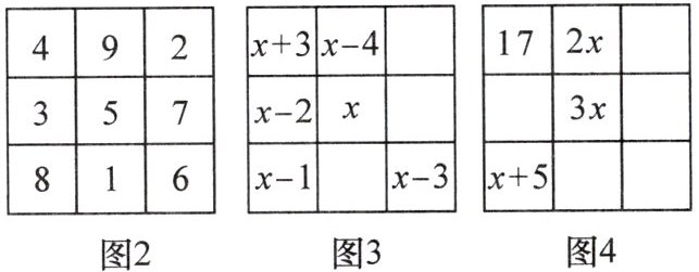 ;(2)设如图3所示的三阶幻方中间的数为$x$($x$为整数),请用含$x$的代数式将图3的幻方补充完整;