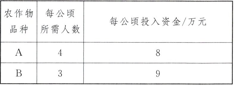 3. (教材P131例3变式)(2024·安徽)乡村振兴战略实施以来,很多外出人员返乡创业。某村有部分返乡青年承包了一些田地,采用新技术种植A,B两种农作物。种植这两种农作物每公顷所需人数和投入资金如下表: