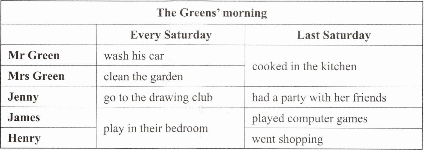 The Greens are my neighbours. They are busy. They usually have different activities. Every Saturday, Mr Green washes his car, Mrs Green cleans the garden, Jenny goes to the drawing club, and James and Henry play in their bedroom. But last Saturday, they changed their plans. Mr Green and Mrs Green cooked in the kitchen, Jenny had a party with her friends, James played computer games, and Henry went shopping.