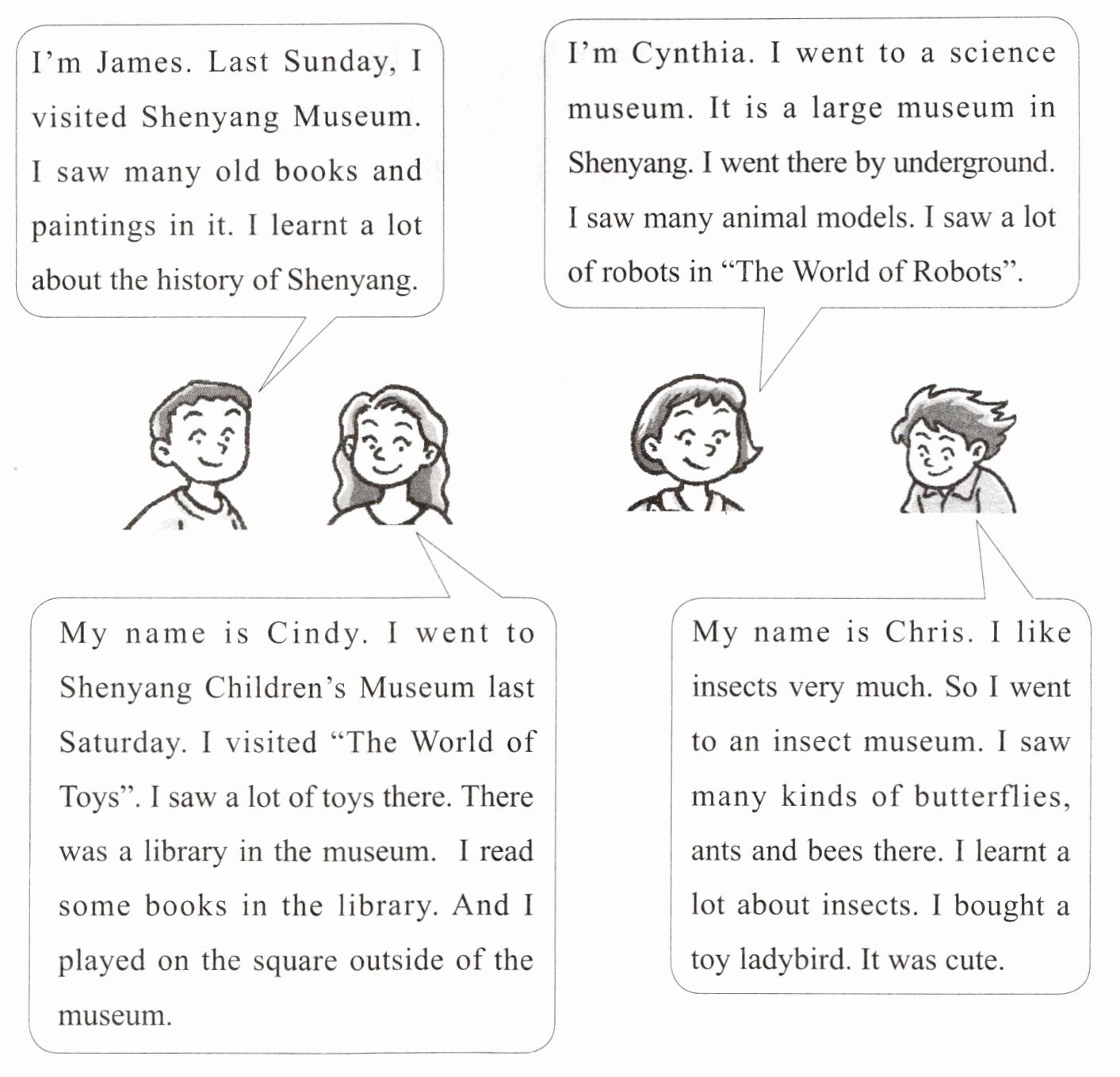My name is Cindy. I went to Shenyang Children's Museum last Saturday. I visited "The World of Toys". I saw a lot of toys there. There was a library in the museum. I read some books in the library. And I played on the square outside of the museum.