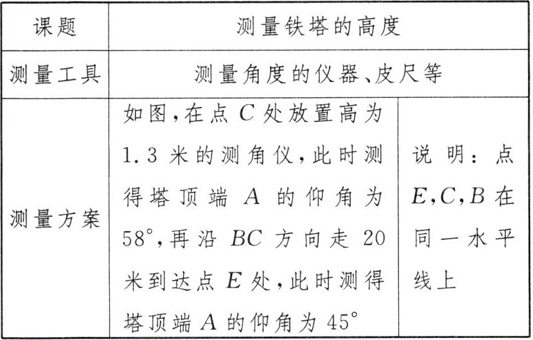 请你根据表中信息帮助该数学兴趣小组求铁塔的高度(结果精确到 $0.1$ 米. 参考数据:$\sin 58^{\circ} \approx 0.85$,$\cos 58^{\circ} \approx 0.53$,$\tan 58^{\circ} \approx 1.60$)