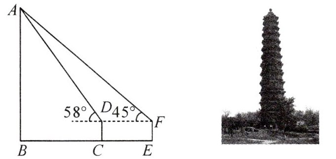 解:延长FD交AB于点G,则$\angle AGF=90^{\circ}$.由题意,得$DF=CE=20\ 米$,$CD=EF=1.3\ 米$,$\angle AFG=45^{\circ}$,$\therefore\triangle AFG$是等腰直角三角形.$\therefore AG=FG$.设$DG=x$,则$AG=20+x$.在$Rt\triangle ADG$中,$\angle ADG=58^{\circ}$,$\tan\angle ADG=\frac{AG}{DG}$,$\therefore\frac{20+x}{x}\approx1.6$,解得$x\approx33.33$.$\therefore AG=33.33+20=53.33(米)$.$\therefore AB=AG+BG=53.33+1.3\approx54.6(米)$.