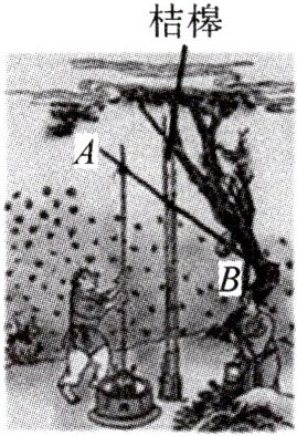 14. 新考向 传统文化 (2024·贵港平南县期中)桔槔,亦叫“桔皋”,我国古代井上汲水的工具. 它是在井旁架上设一杠杆,杠杆上竹竿一端 $A$ 处系绳子,绳子另一端悬绑汲器,竹竿另一端 $B$ 处绑石块等重物,用不大的力量即可将灌满水的汲器提起,桔槔的使用体现了我国古代劳动人民的智慧. 如图,这是《天工开物·水利》中的桔槔图,若竹竿 $A$,$B$ 两处的距离为 $2m$,当汲器伸到井口时,绳子受重力作用垂直于水平面,此时竹竿 $AB$ 与绳子的夹角为 $53^{\circ}$,则绑重物的 $B$ 端与悬绑汲器的绳子之间的距离约为
