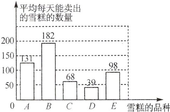 5. 小丽统计了最近一个星期李大爷平均每天能卖出的 $A$,$B$,$C$,$D$,$E$ 五个牌子的雪糕的数量,并绘制出如图所示的统计图. 根据小丽统计的结果,请你为李大爷设计一个进货方案.