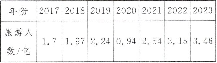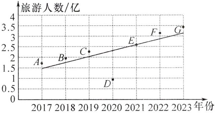 2. 近年来,以冰雪运动为主题的冰雪旅游发展迅速. 如图表所示的是某地 2017 年 - 2023 年冰雪季旅游人数与年份之间的关系,若去掉一个点后,剩下的六个点大致分布在一条直线附近,则这个点是(